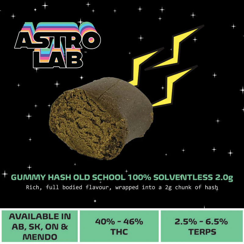 Astrolab 100% Solventless Gummy Hash is the perfect texture for for a hash kettle, bong, snakes, hooks, or anything else you can imagine. We infuse dry sift hash with rosin to create a flavourful, completely solventless hash with a perfectly pliable consistency. Whether you're rolling a snake in the grass joint, enjoying a pipe, or firing up your Happle/Hash Kettle, this modern take on a traditional classic is easy to shape to your needs.