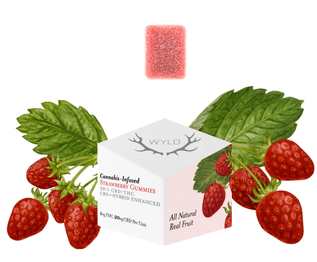 Wyld Strawberry Hybrid Enhanced CBD:THC Soft Chews are a 20:1, CBD-dominant 10-pack made sustainably made using real fruit, botanical terpenes and natural flavours. Each Soft Chew contains 20mg CBD and 1mg THC, for a total of 200mg CBD and 10mg THC. All Wyld Soft Chews are packaged in an all-new compostable pouch, and our recipes are formulated by food scientists to provide consistent experiences that taste amazing. Wyld Soft Chews use sunflower lecithin to improve biovailability and onset time and are made to be thermostable up to 60 degrees celcius, with a firm texture that doesn't stick to your teeth. Each Wyld Strawberry Hybrid Enhanced Soft Chew contains 20mg CBD and 1mg THC combined with the terpenes limonene, linalool, alpha-pinene, and beta-pinene for a subtly uplifting experience. Wyld uses carbon neutral manufacturing to support a healthy planet.